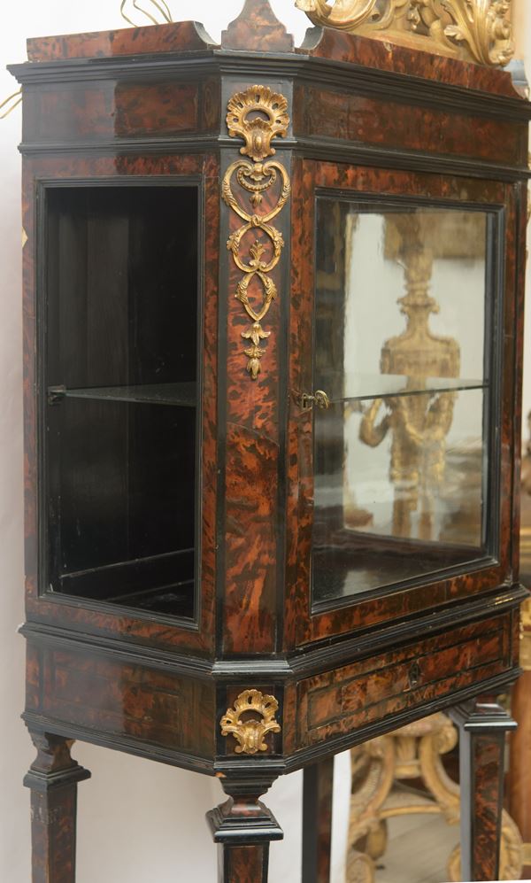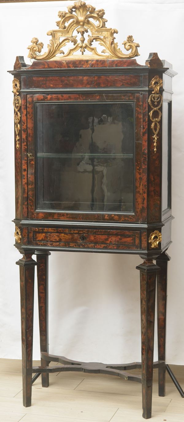 a due corpi, con cassetto centrale e anta superiore a vetro. Legno ebanizzato con materiali pregiati e decorazioni e cimasa in legno dorato e intagliato. Quattro piedi rastremati e raccordati. Mancante di un vetro laterale. Restauri e mancanze.