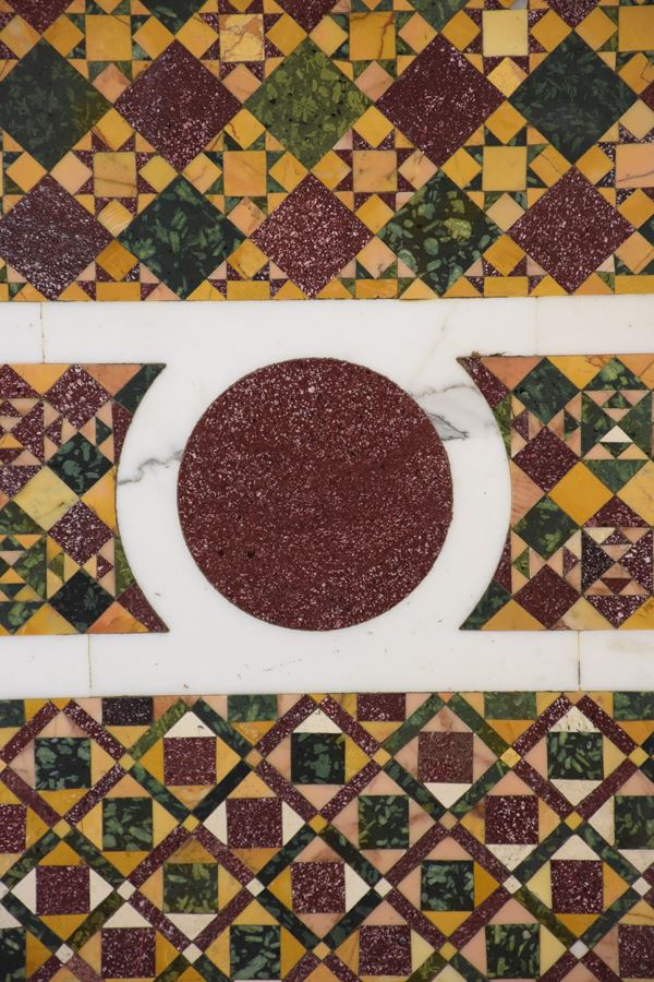 In stile cosmatesco a riquadri geometrici rettangolari e circolari con tessere in porfido rosso serpentino e giallo antico.