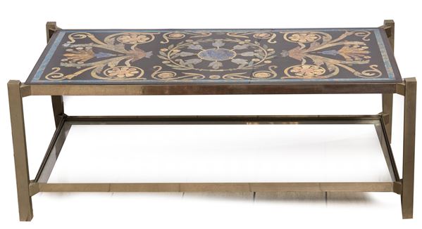 policroma con decorazioni floreali. Importante lesione centrale. Montato su basamento in metallo cromato, piano inferiore in vetro.