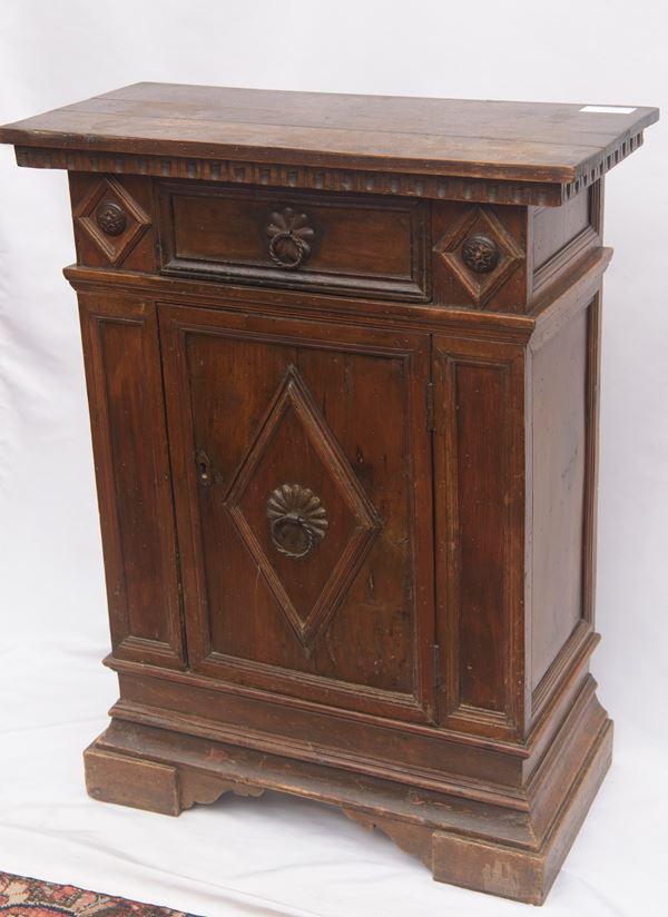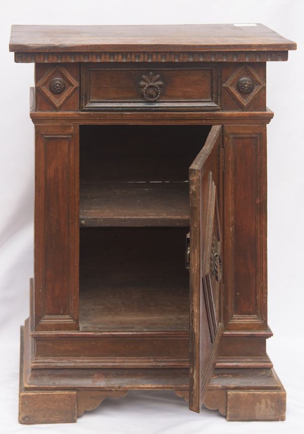in legno di noce, a singola anta e cassettino superiore. Decori a formelle.