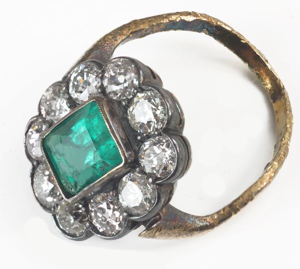 con smeraldo centrale e diamanti taglio brillante. Cerchio deformato, smeraldo lesionato. Peso 3,8 gr