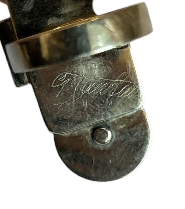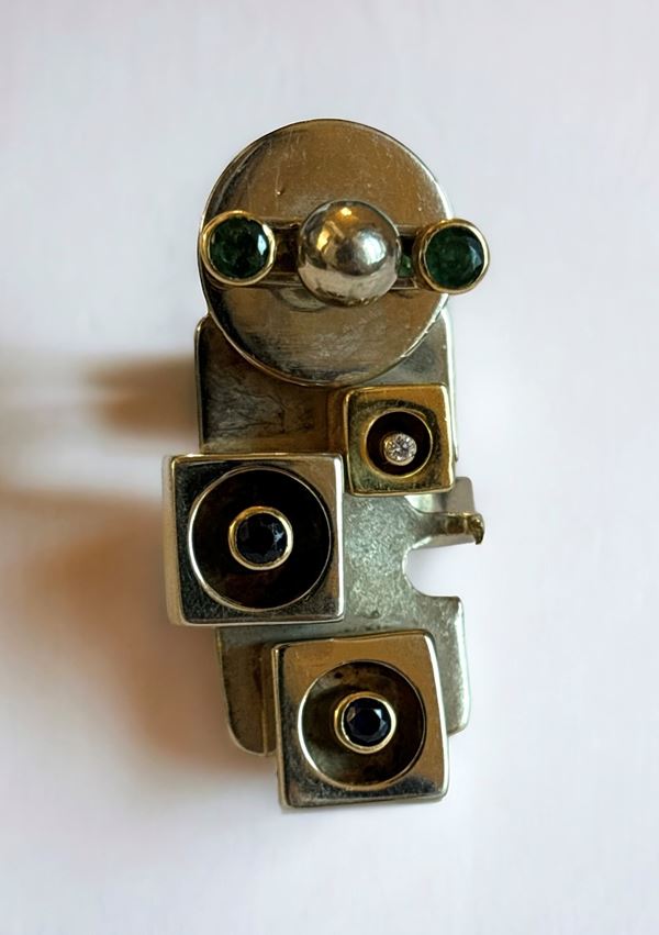 In oro 18 Kt con rubini, smeraldi e un brillante. Peso complessivo 21,4 gr. Firmato al retro. Es. n. 1/3.