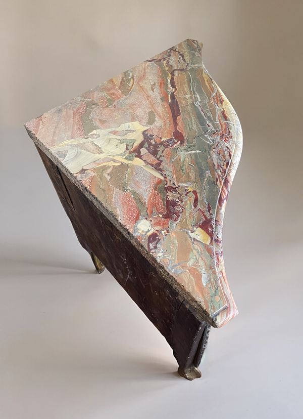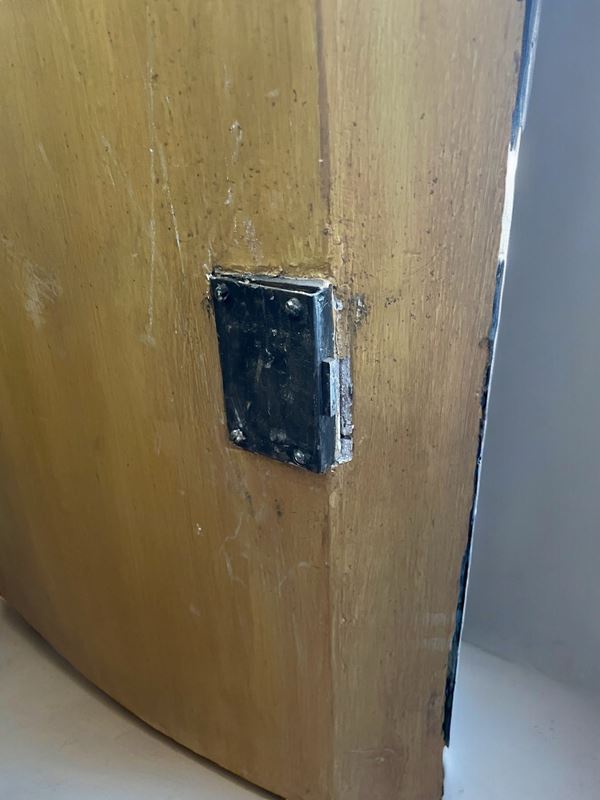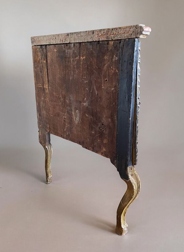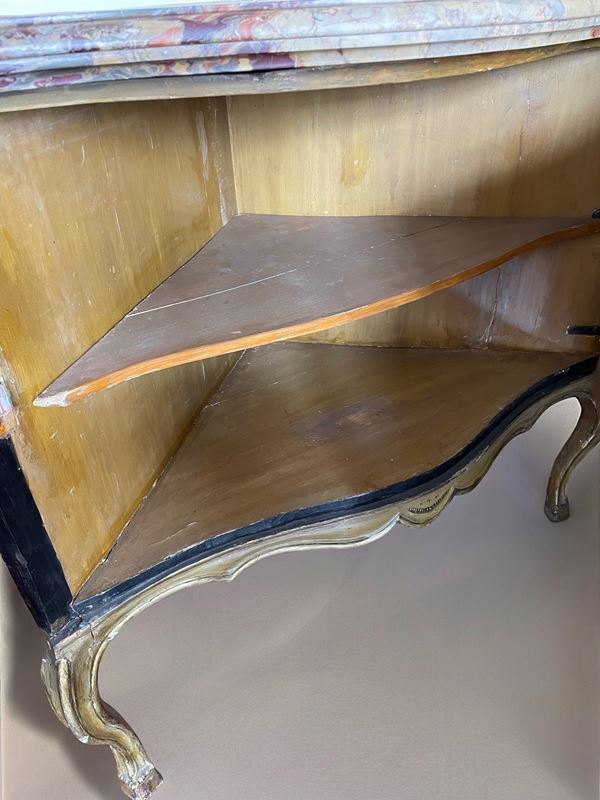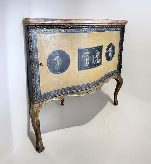 In legno laccato con sportello unico centrale decorato a fondo ocra con tre riquadri decorati con figure a grisaille. Gambe leggermente ricurve. Piano in marmo diaspro di Sicilia. Difetti.