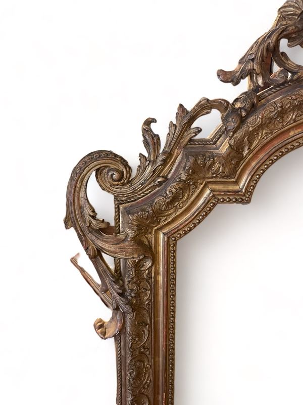 In legno dorato con parti in rilievo in pastiglia. Ampia cimasa superiore.