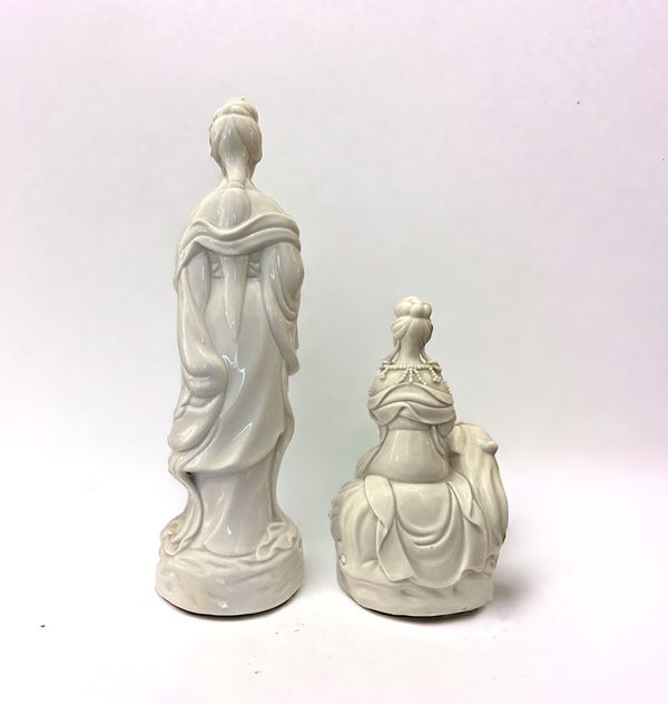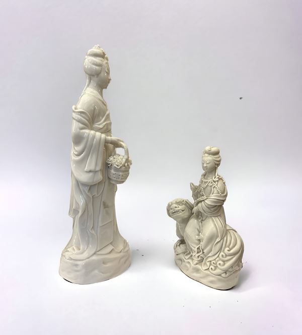 Coppia di sculture orientali in porcellana; Guanyn su Cane di Fo e Guanyn, Prima metà XX secolo