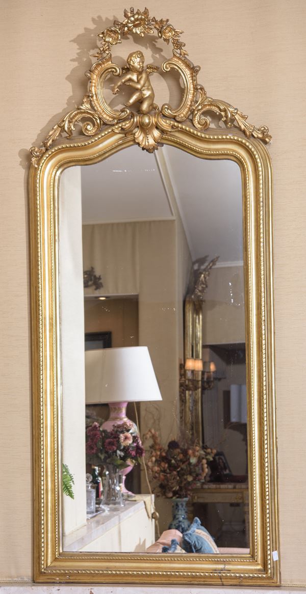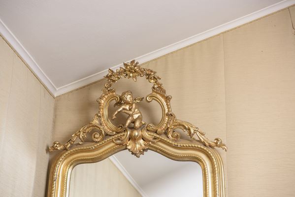 in legno dorato e intagliato, con putto entro cimasa superiore. Manifattura francese, Luigi Filippo, metà XIX secolo.