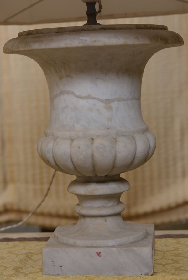 in marmo bianco, montati a lampada da tavolo. Funzionanti, da revisionare. Restauri e mancanze.