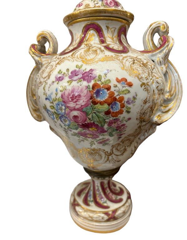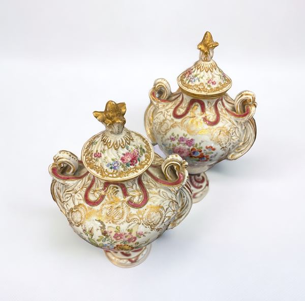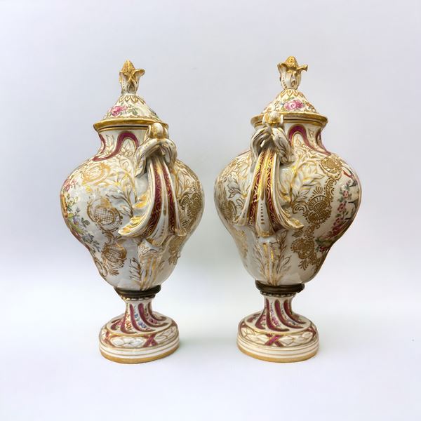 Coppia di vasi in porcellana policroma con coperchio, XX secolo