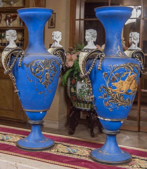 a fondo blu cobalto, con decorazioni nero e oro, anse con figure muliebri. Recanti etichetta "W. Guérin & c." Vari difetti.