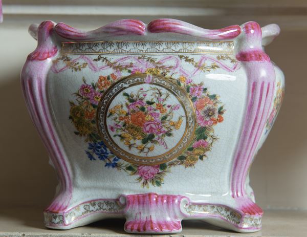 composta da due potiches e un cachepot in ceramica invetriata policroma con decorazioni floreali. Stampigliatura alla base: stella coronata 1895