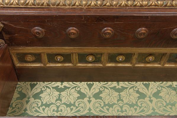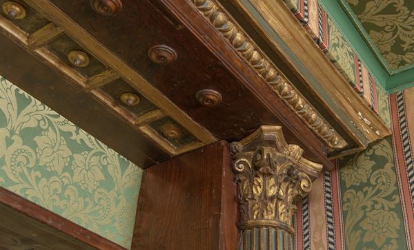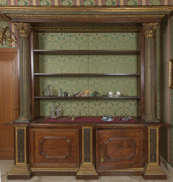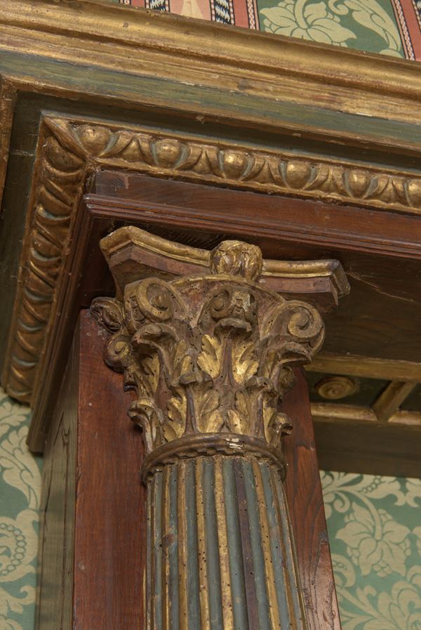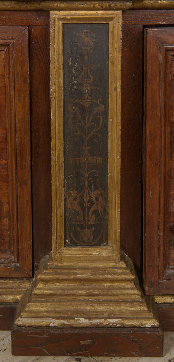 in legno di noce intagliato e dorato, con lesene a mezze colonne con corpo centrale scanalato e base e capitello dorato. Base composta da due sportelli e quattro ripiani con lesene laccate e dorate. Elementi antichi assemblati nel XX secolo. Restauri e mancanze.