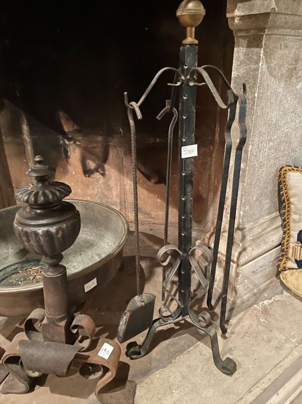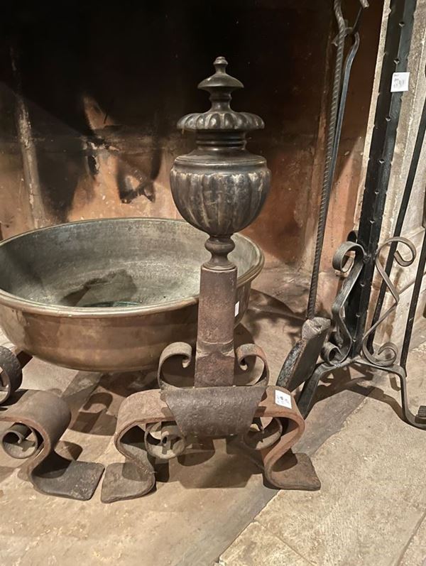 Composta da: coppia di alari (H 60 x P 55 cm), porta attrezzi ( H 85 cm; tre di cui uno mancante) e grande ciotola in rame (D 50 cm).