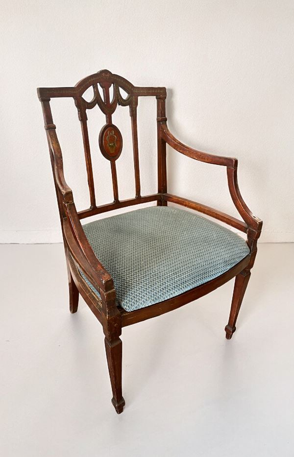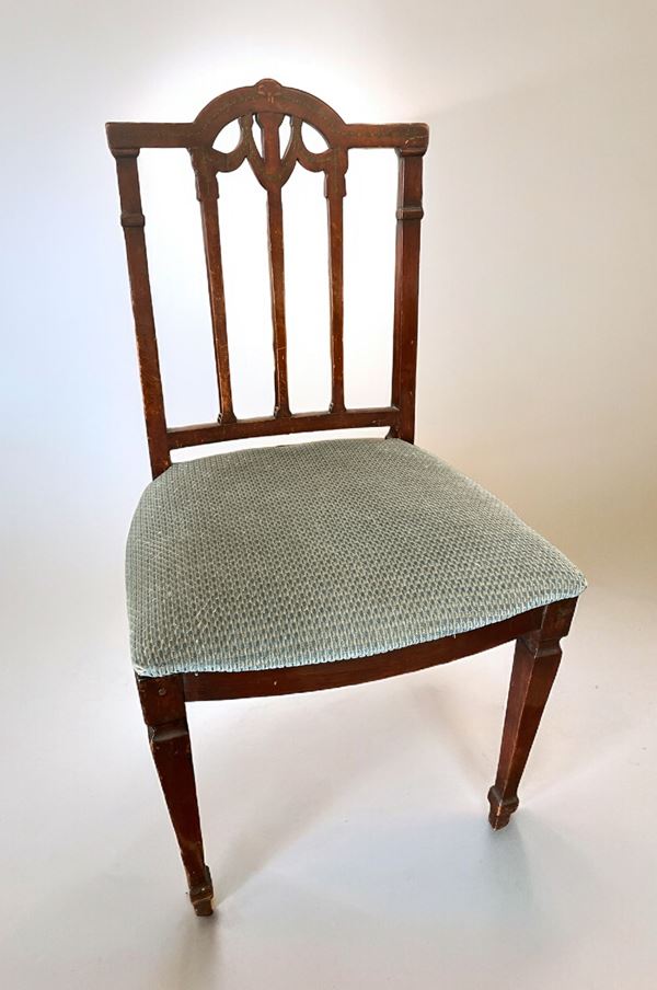 Composto da sei sedie e due capotavola. In legno di mogano parzialmente dipinto a motivi floreali. Sedute in paglia di Vienna.