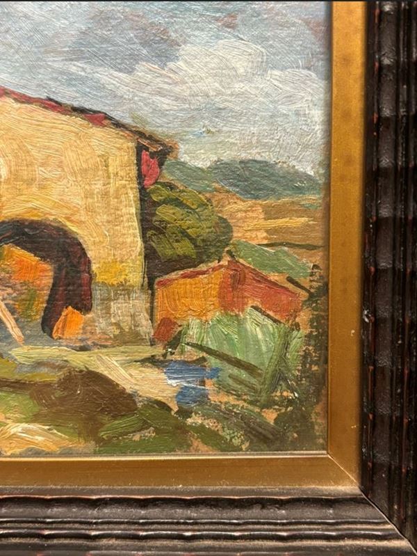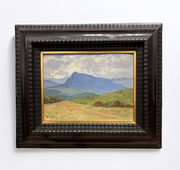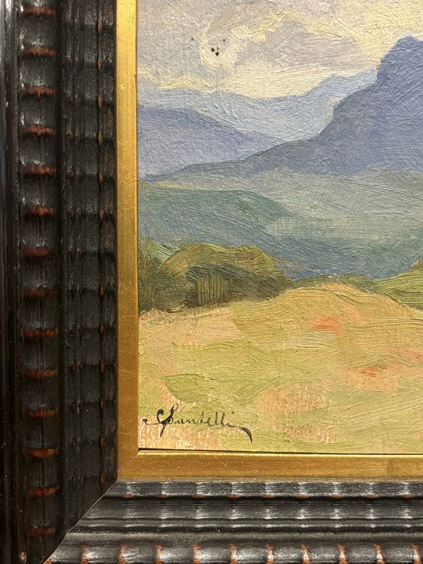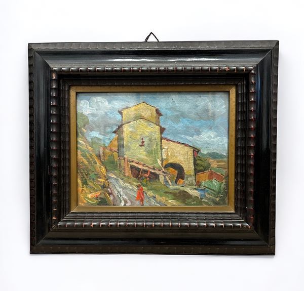 Coppia di dipinti. Scorcio di paese e Paesaggio montano