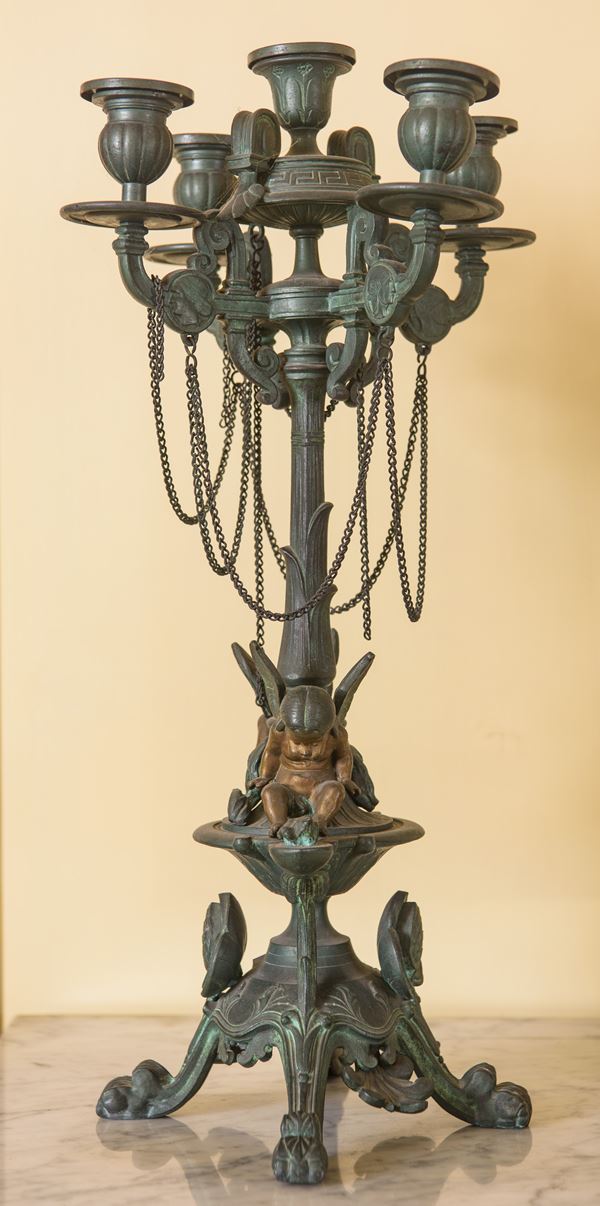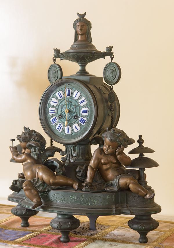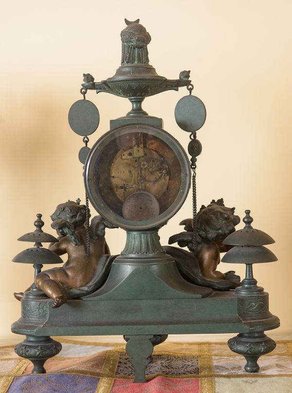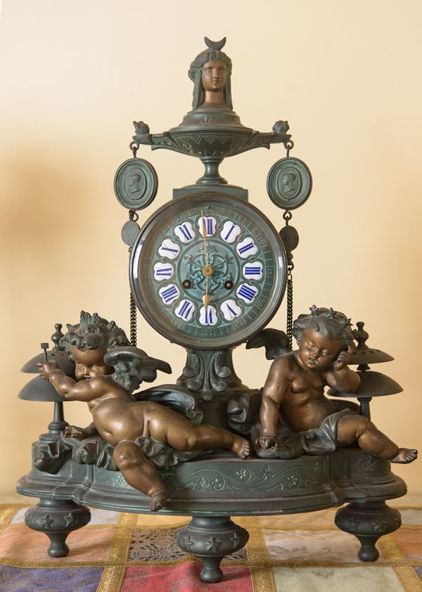 in bronzo a patina verde, con amorini poggianti sulla base. Di gusto eclettico. Manifattura francese. Quadrante con numeri romani, meccanica con suonerie ore e mezz'ore da revisionare.