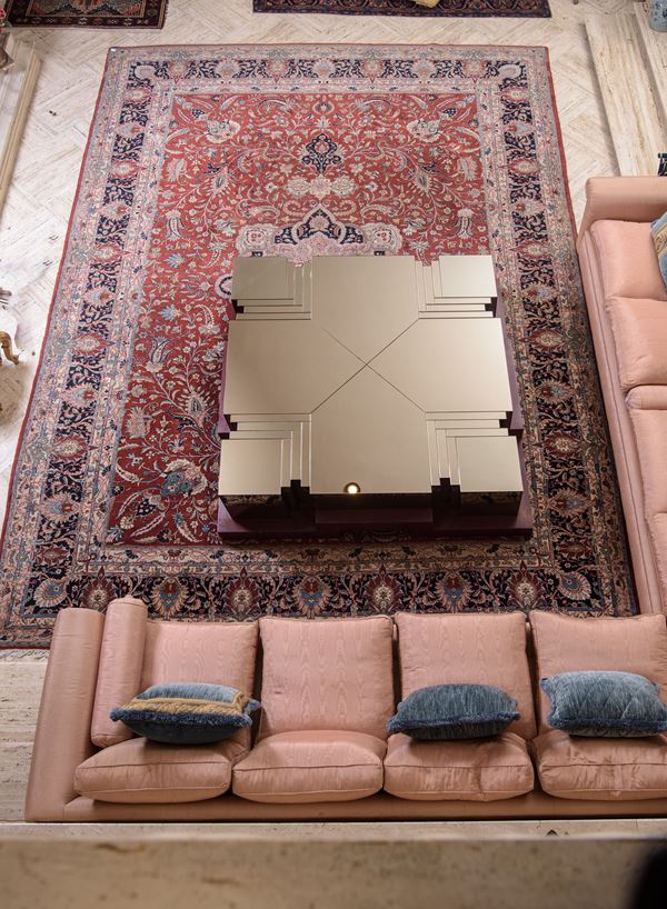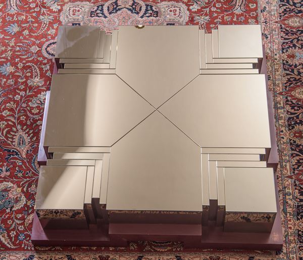in specchi fumè sagomati e molati. Poggiante su basamento in legno. Manifattura italiana, anni '80.