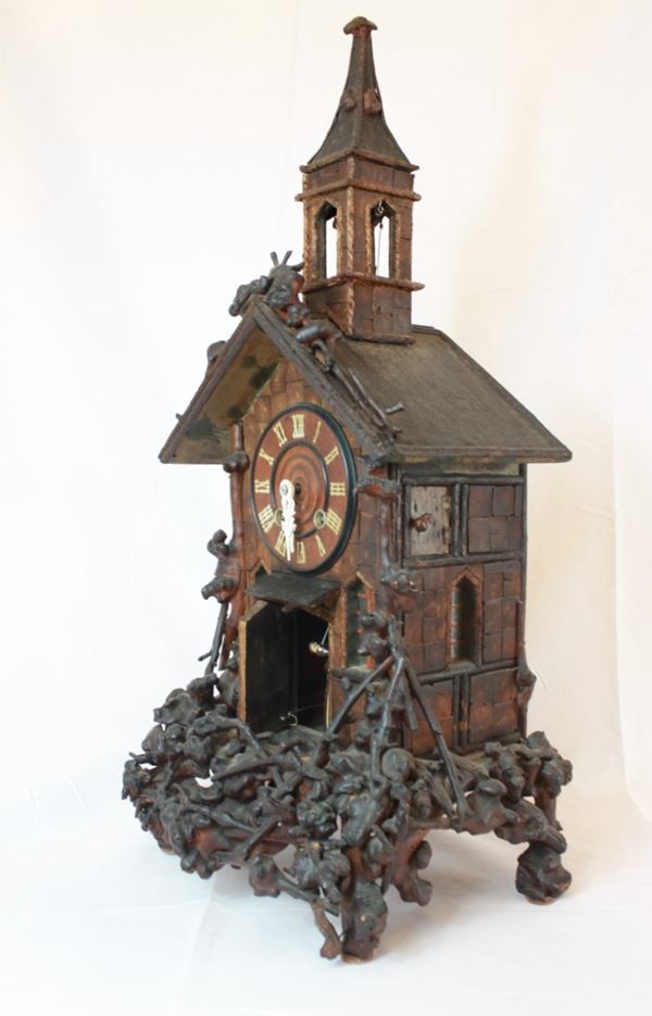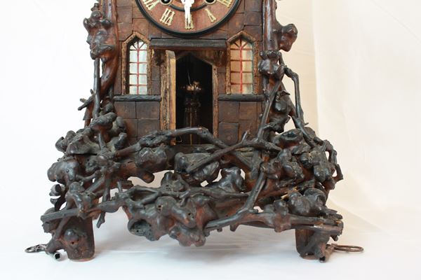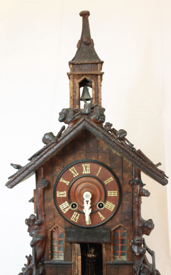 In legno di palissandro impiallacciato. Movimento a 1/2 ore a doppia spoletta. Da revisionare. Iscirizione a matita sul retro. Difetti.