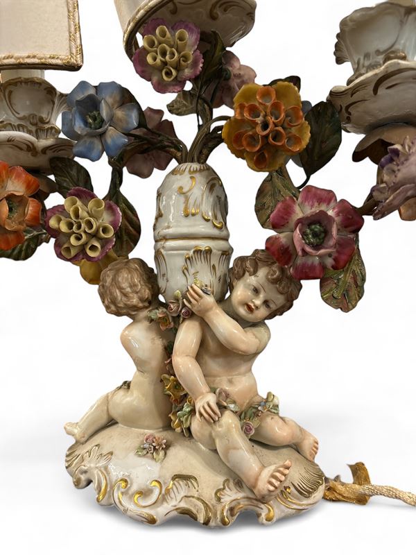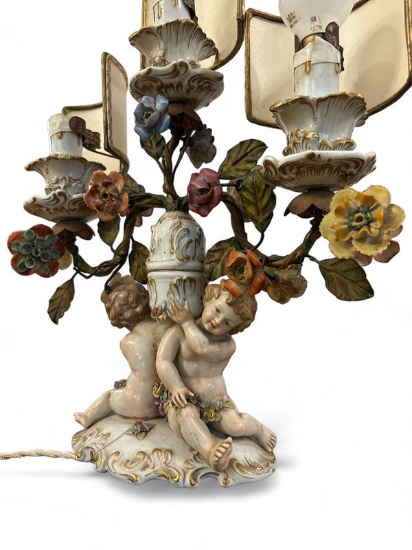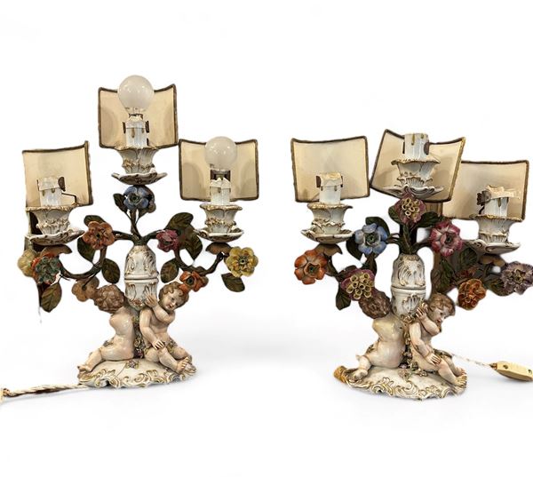 CAPODIMONTE - Coppia di candelabri a tre bracci, prima metà e XX secolo