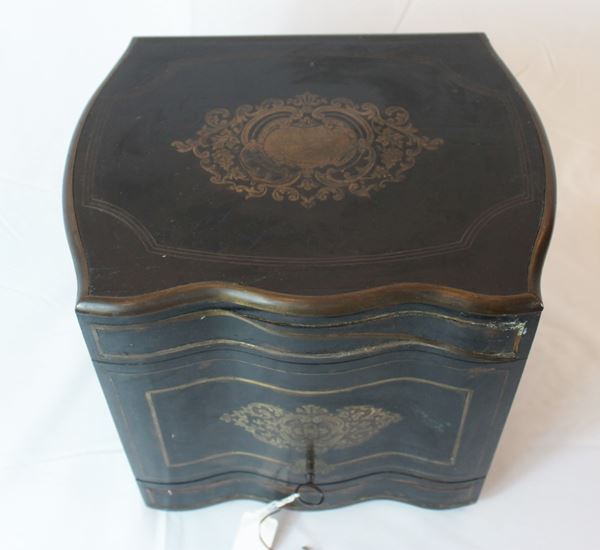 In legno ebanizzato. Fronte mosso. Coperchio inciso in ottone sagomato. All'interno due porta sigari e un servizio da liquore composto da due bottiglie ed otto bicchierini.