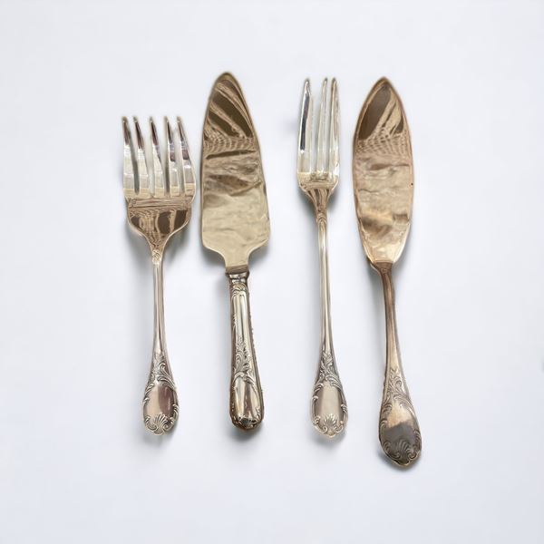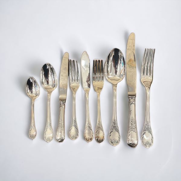Servizio completo da 12 persone, composto da: 12 forchette, 12 forchette da pesce, 12 forchette da frutta, 12 forchette da dessert, 12 coltelli, 12 coltelli da pesce, 12 da frutta, 12 cucchiai, 12 cucchiai da risotto, 12 cucchiai da dessert, 12 cucchiai da the, 12 cucchiai da caffè, 1 mestolo, 1 forchettone da pesce, 1 coltello da pesce, 1 forchettone da arrosto, 1 coltello da arrosto, 1 cucchiaio da servizio, 1 forchettone da servizio, 1 paletta da torta, 1 paletta da torta o gelato, 1 cucchiaio grande da portata, 1 saliera completa (sale e pepe).