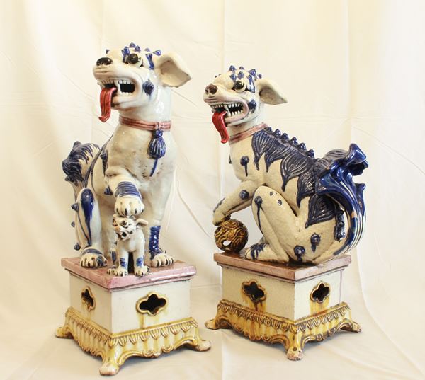 In ceramica a smalti blu, rosa e giallo. Manifattura italiana.