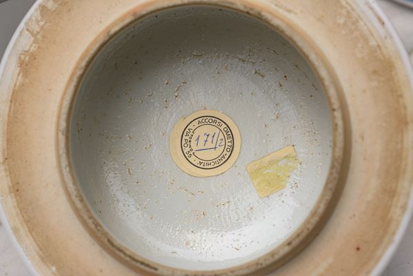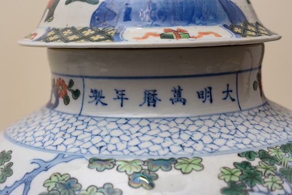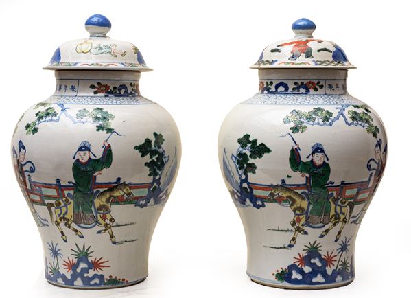In porcellana a smalto Wucai, decorate con scene di vita campestre. Bollo originale Ometto-Accorsi, Torino, via po 55. Cina, fine dinastia Qing - inizio periodo Repubblica (1912 - 1949). Marchio apocrifo Jiajing sul collo.