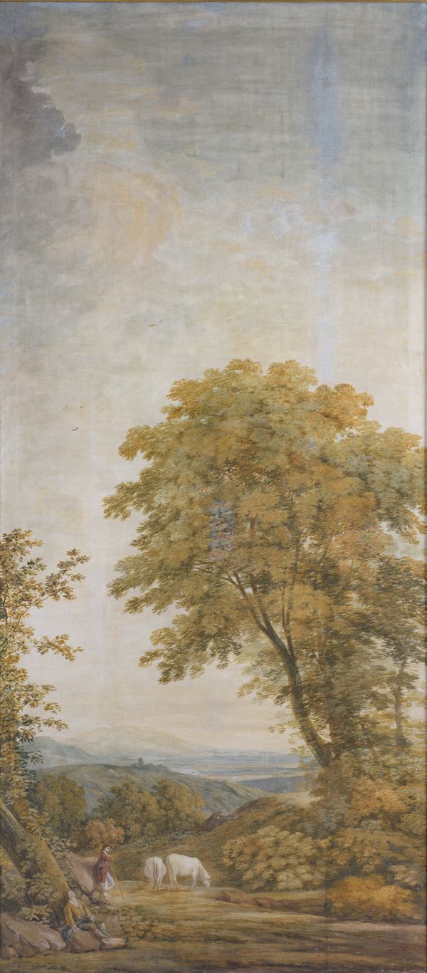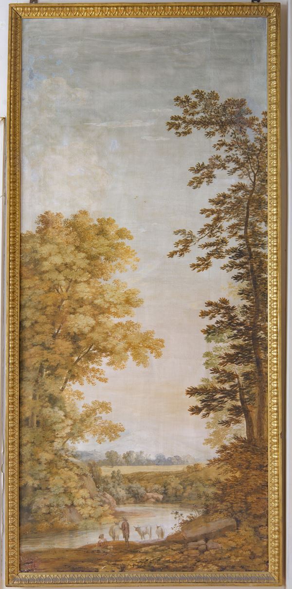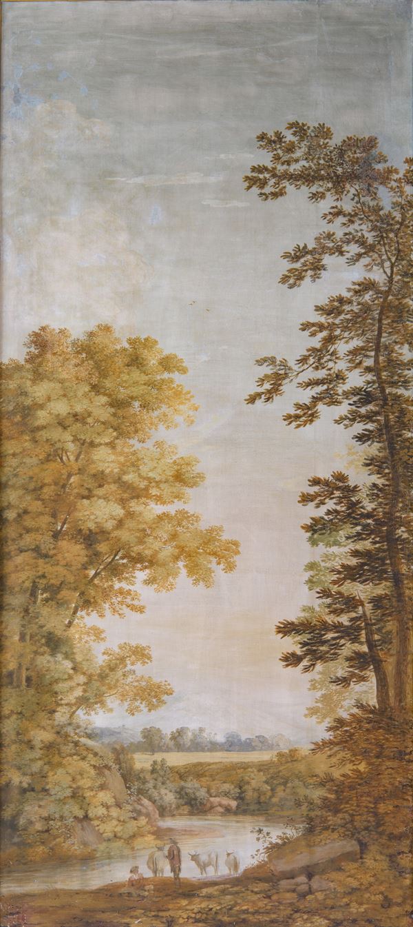 Coppia di pannelli con vedute fluviali e campestri, fine del XIX scolo