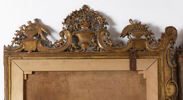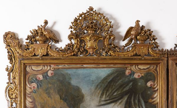 Raro e raffinato paravento di grandi dimensioni, a due ante in legno finemente intagliato e dorato a motivi floreali. Intagliato a giorno al recto e al verso. Di linea reggenza, fine del XVIII inizi del XIX secolo. Luce interna: 193 x 106 cm (singola nata). Tele interne non pertinenti, raffiguranti "Narciso" e "Venere e Amore scoprono la morte di Adone".