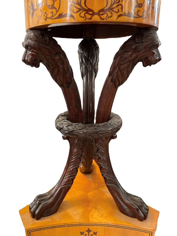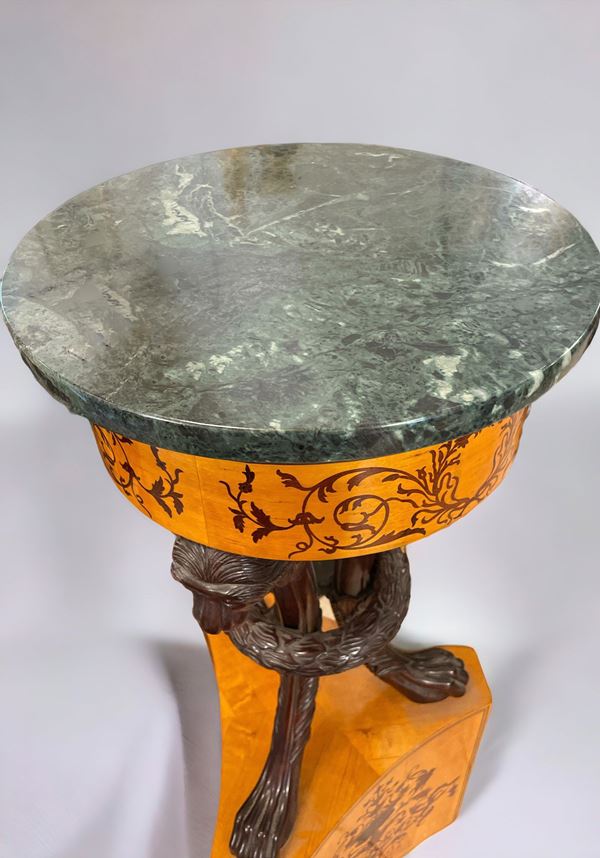 con tripode centrale, poggiante su basamento centinato, in legno di acero con intarsi in amaranto. Piano superiore in marmo verde Alpi. In stile Carlo X