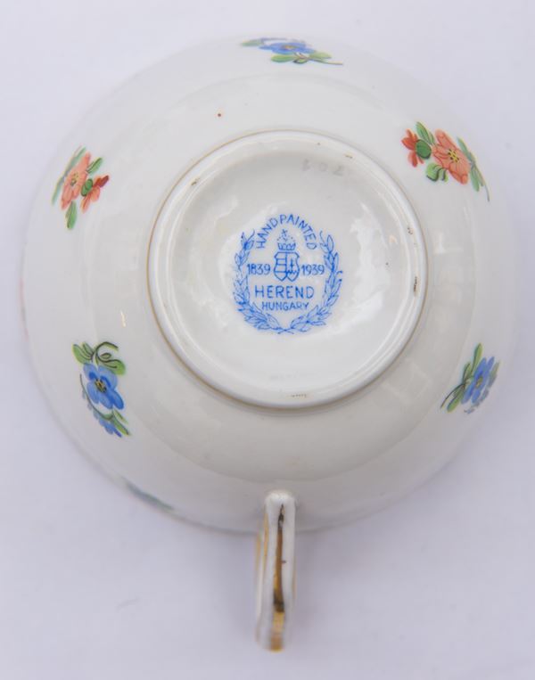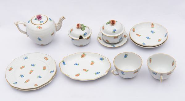 Composto da: due tazze, due sottopiatti, due piatti da dessert, un vassoio ovale, una teiera, una zuccheriera, un contenitore da marmellata. Marchio la retro: Herend 1829 - 1939. Dipinto a mano.