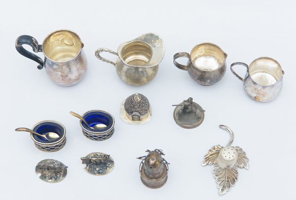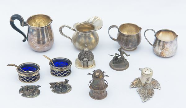 Varie manifatture, forme e dimensioni. Tra cui due saliere con interno in vetro blu firmate Pinci, Roma. Peso totale 345 gr.