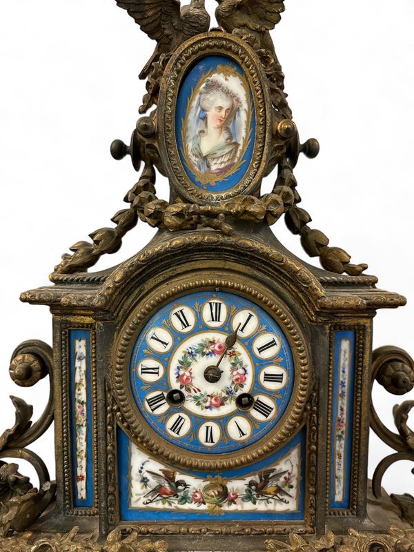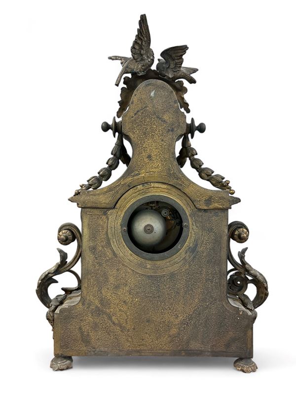 In antimonio, con applicazioni in porcellana policroma e decori floreali. Manifattura francese. Meccanica da revisionare.