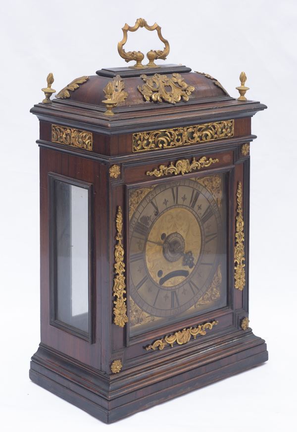 In palissandro. Cassa squadrata con finiture in bronzo. Quadrante a due fori di carica con fascia oraria a numeri romani.