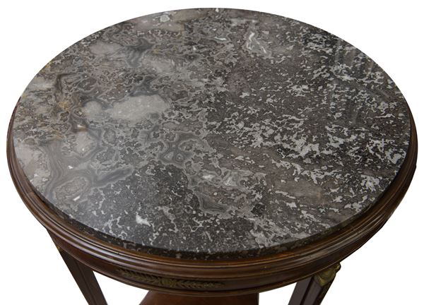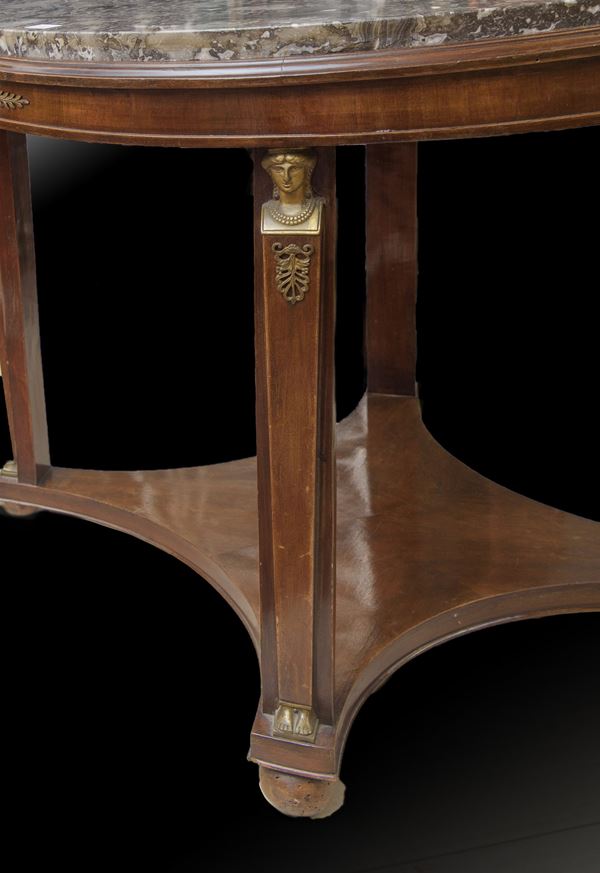 in legno di mogano con decori in bronzo, quattro piedi rastremati e raccordati. Piano superiore in marmo fossile/Lumachella.
