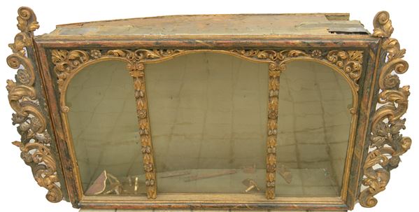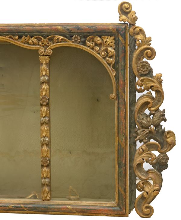 ad incasso, in legno laccato e dorato, con anta scorrevole in vetro. Con fregi decorativi laterali in legno dorato e intagliato. Restauri e mancanze. Provenienza: dalla collezione d'arte di un importante Hotel di Via Veneto - Roma.