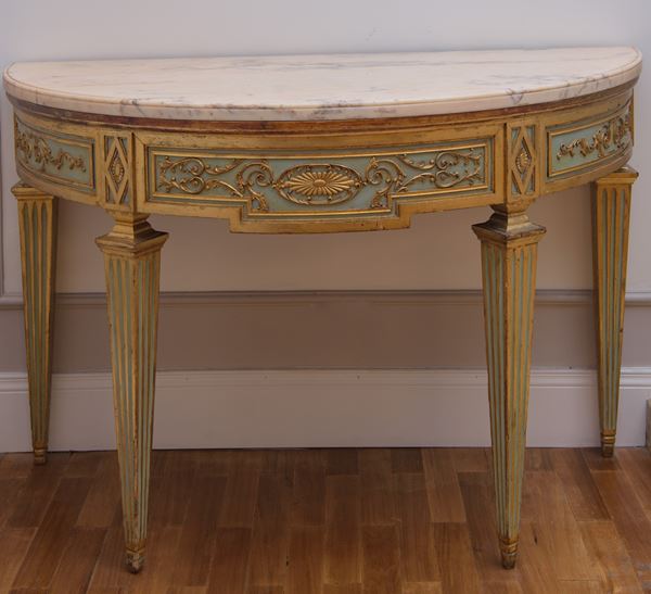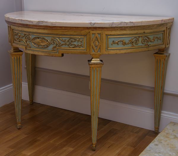 a mezzaluna, in legno laccato e argentato a mezza. Piano superiore in marmo bianco di Carrara. Stile Luigi XVI.