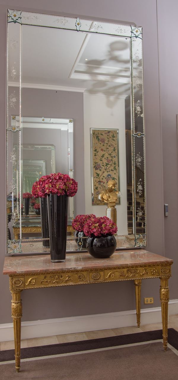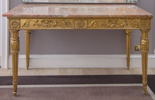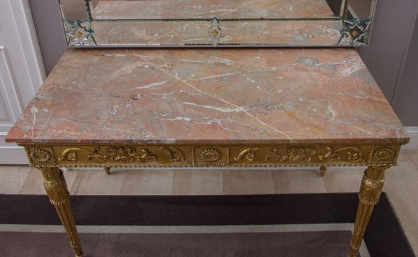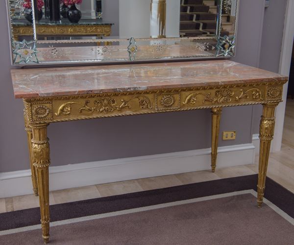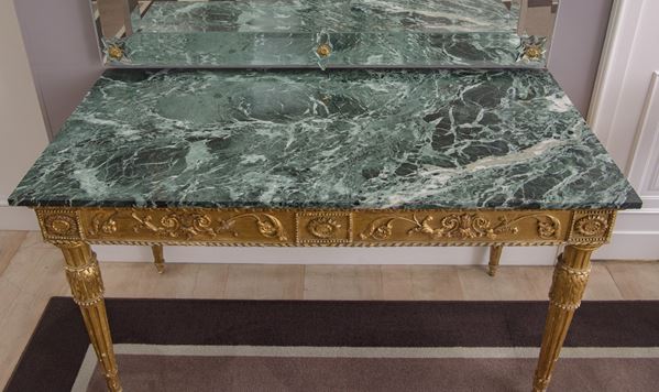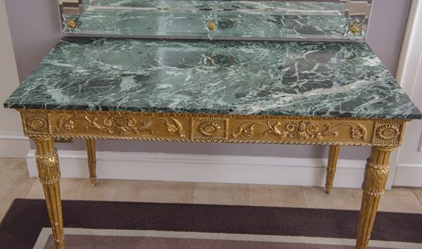 in legno dorato e intagliato. Stile Luigi XVI. Piano superiore in marmo, uno Portasanta, l'altro Verde Alpi.