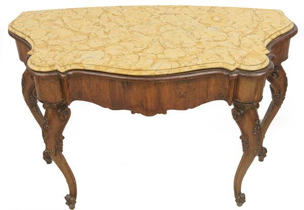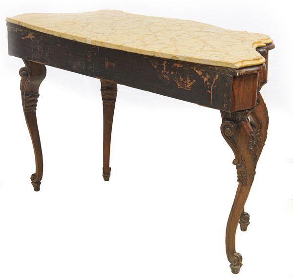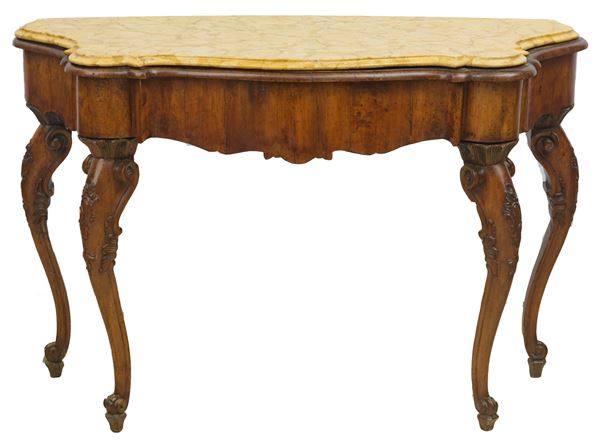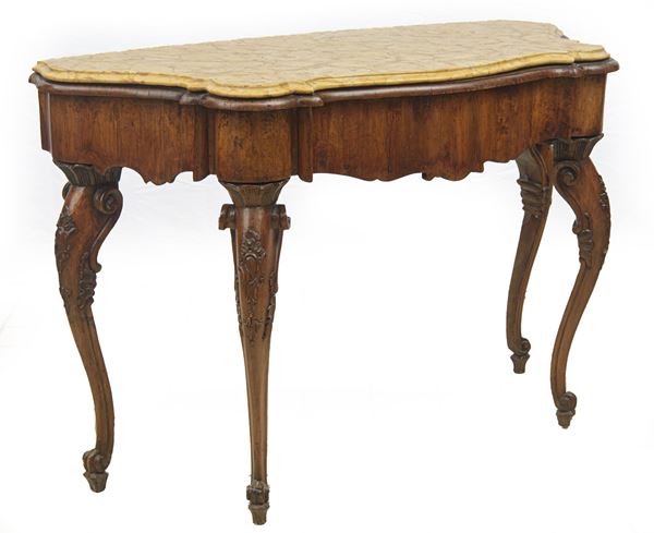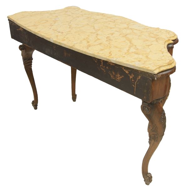 in legno di noce, quattro piedi. Con piano superiore in marmo Giallo di Verona. Importanti restauri, sostituzioni al piano in legno e parti non pertinenti. In parte del XVIII secolo.