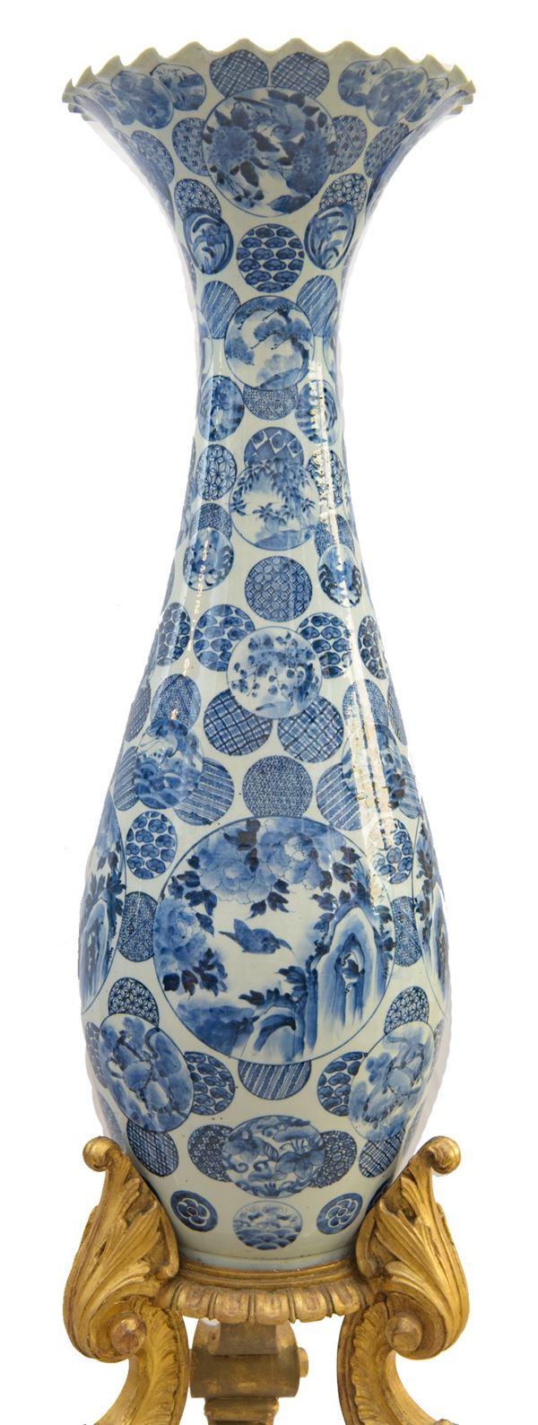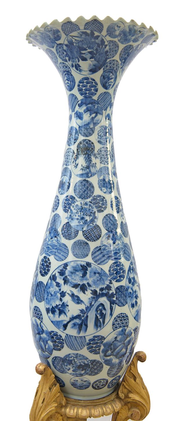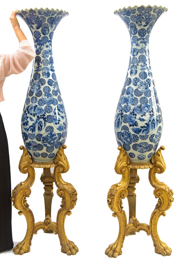 Coppia di vasi in porcellana bianca e blu. Manifattura giapponese, periodo Meiji, XIX secolo. Dimensioni: 111 x Diametro 38 cm.