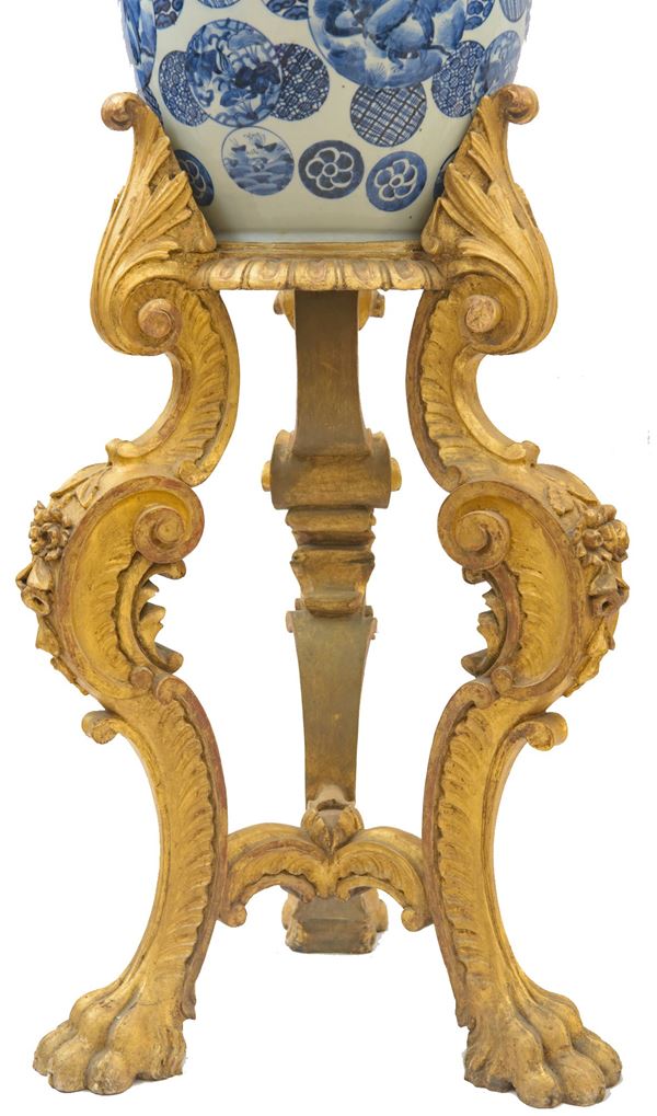 Basamenti a tripode in legno intagliato e dorato, con piede ferino. Manifattura francese, seconda metร del XIX secolo. Dimensioni: 71 x 48 x D. 42 cm.