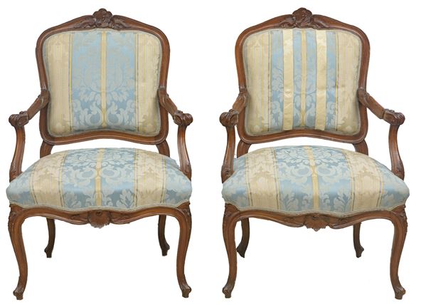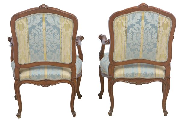in legno di noce con schienale e seduta imbottita. In stile Luigi XV