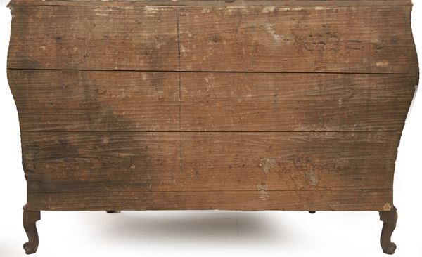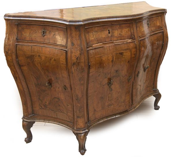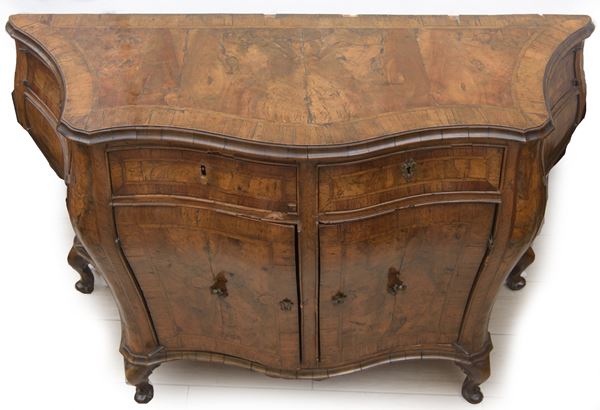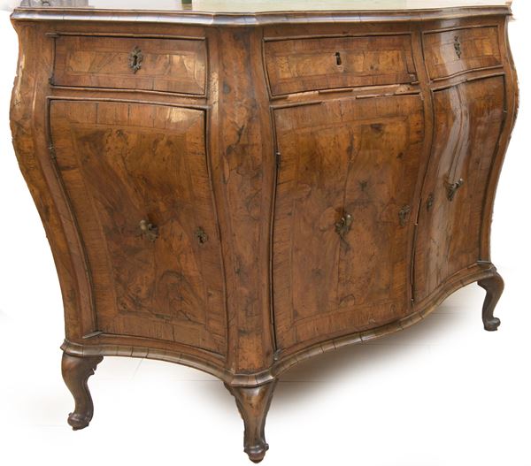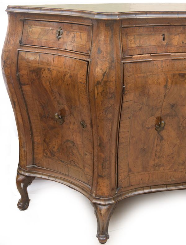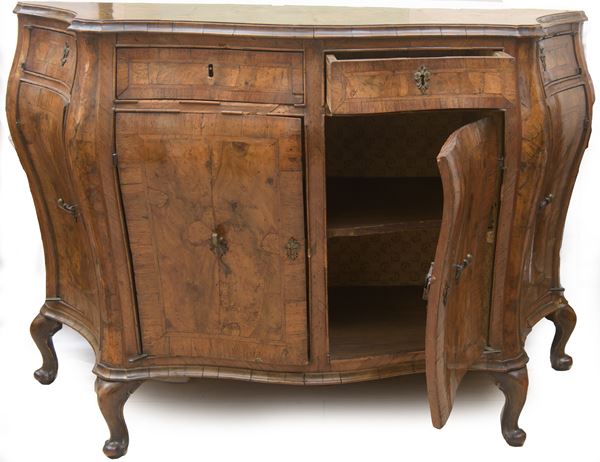 a quattro ante, due scomparti laterali superiori e due cassetti frontali superiori. In legno lastronato in noce e radica di noce. Fianchi bombati e fronte centinato. Mancanze.