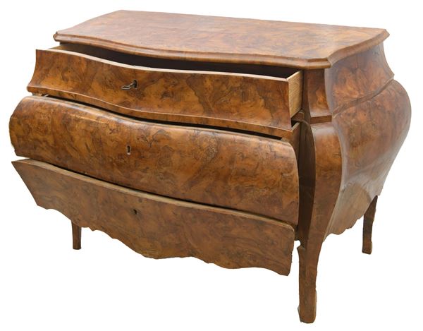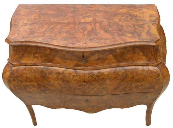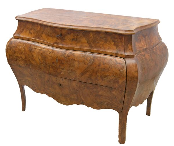 di forma bombata, a due cassetti e mezzo cassetto senza traversa, in legno e radica di noce. Restauri e mancanze.