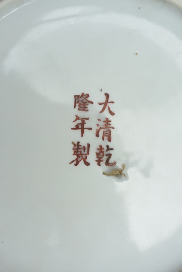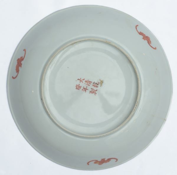 Con decori raffiguranti un drago e una fenice in volo tra nuvole stilizzate. Bordo decorato a motivi geometrici. Manifattura cinese. Periodo e marchio Guangxu. Piccola felatura al bordo.