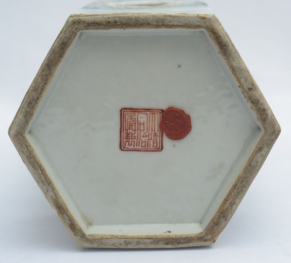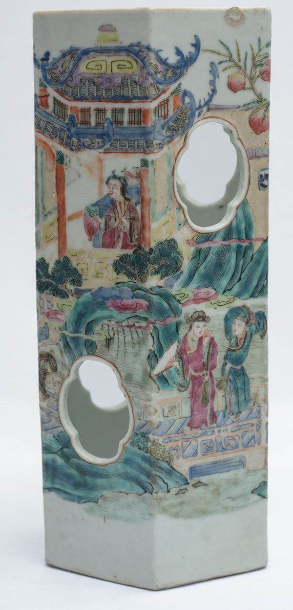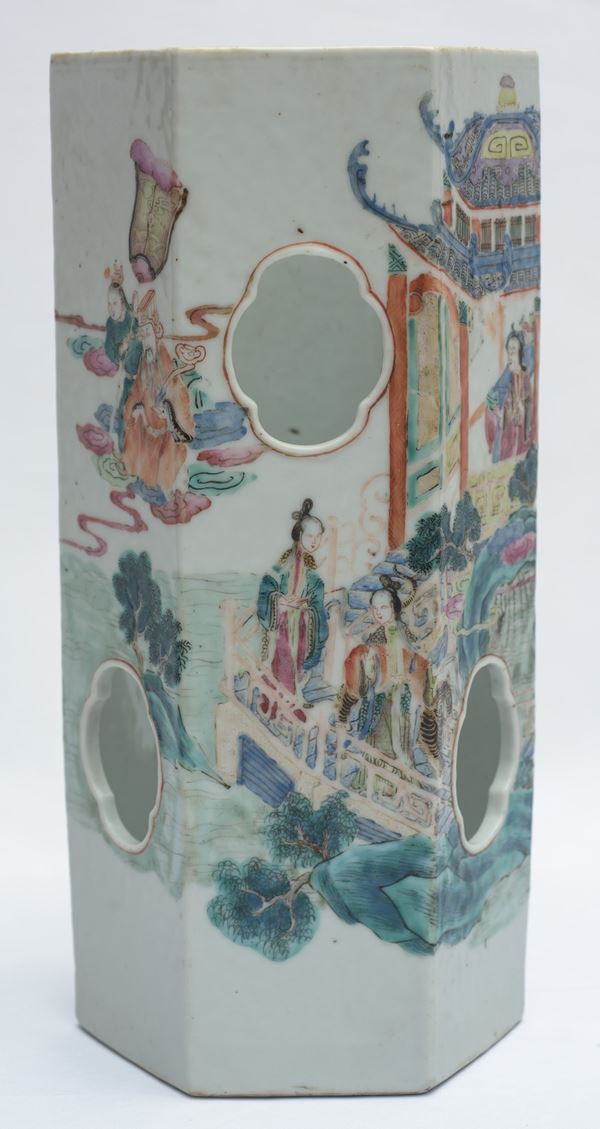 Di forma esagonale, con 6 fori polilobati. Vengono raffigurate scene di corte. Marchio Daoguang. Manifattura cinese. Periodo Daoguang. Piccolo difetto laterale.