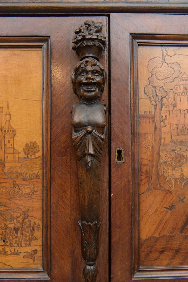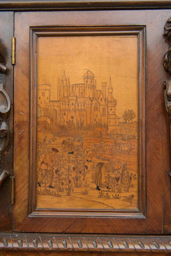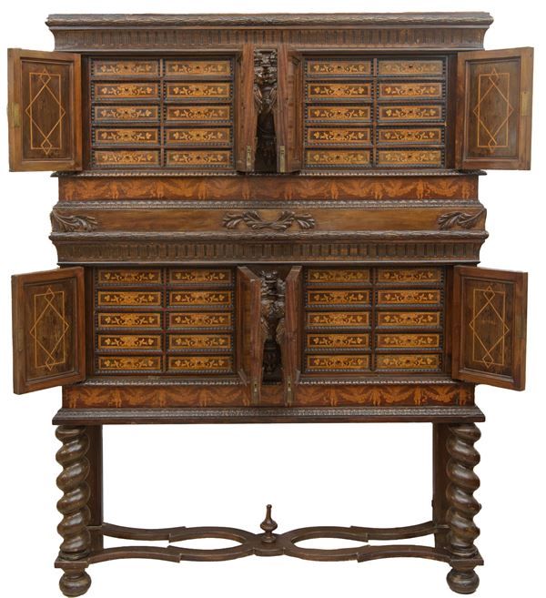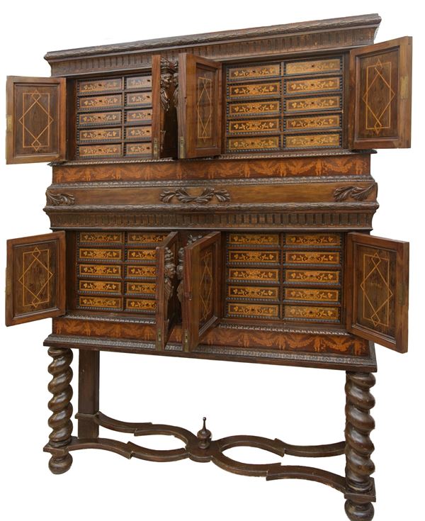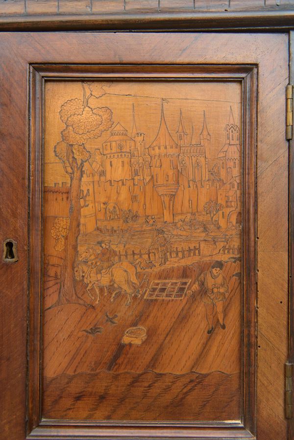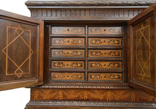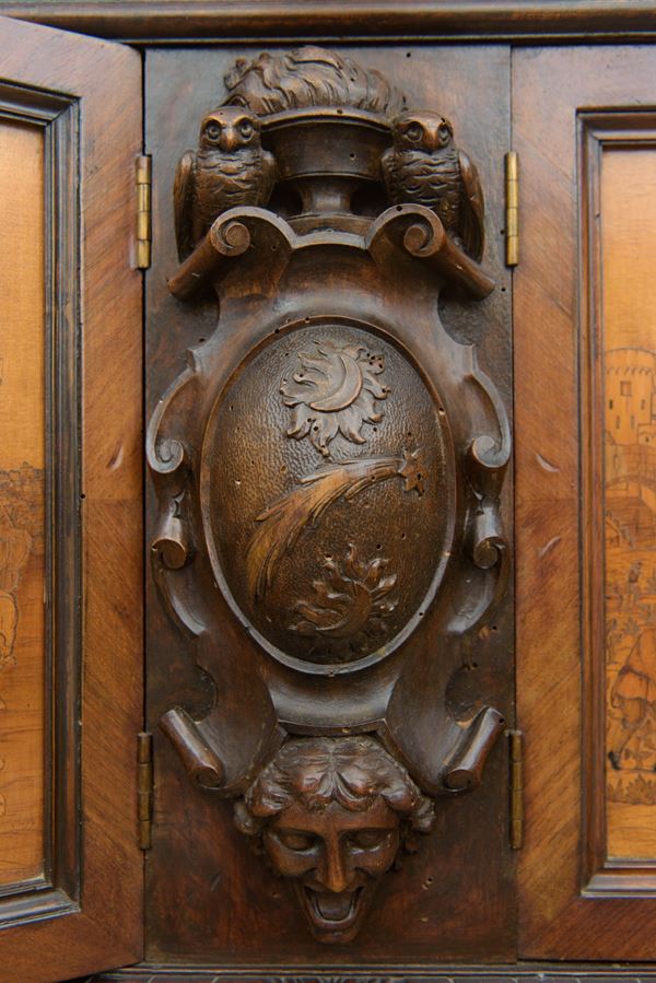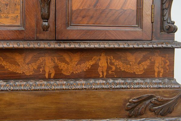 in legno di noce intarsiato entro formelle, raffiguranti paesaggi e scene campestri. Sul fronte ghirlanda di putti a sorreggere festoni. Otto sportelli con cassettiere interne. Manifattura italiana, città di Rolo, Emilia. Basamento con gambe a tortiglione riunite da crociera.
