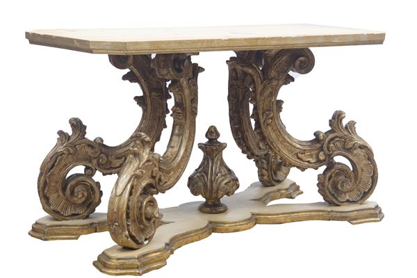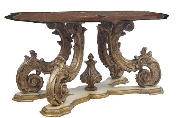 in legno intagliato e argentato a mecca. Piano superiore in marmo Rosso Francia con fascia laterale verde Alpi. Composto da elementi antichi assemblati, piano superiore manifattura del XX secolo