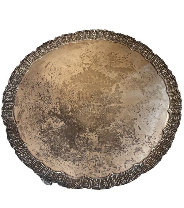 Argento sbalzato e inciso. Con stemma nobiliare. Peso 4290 gr.