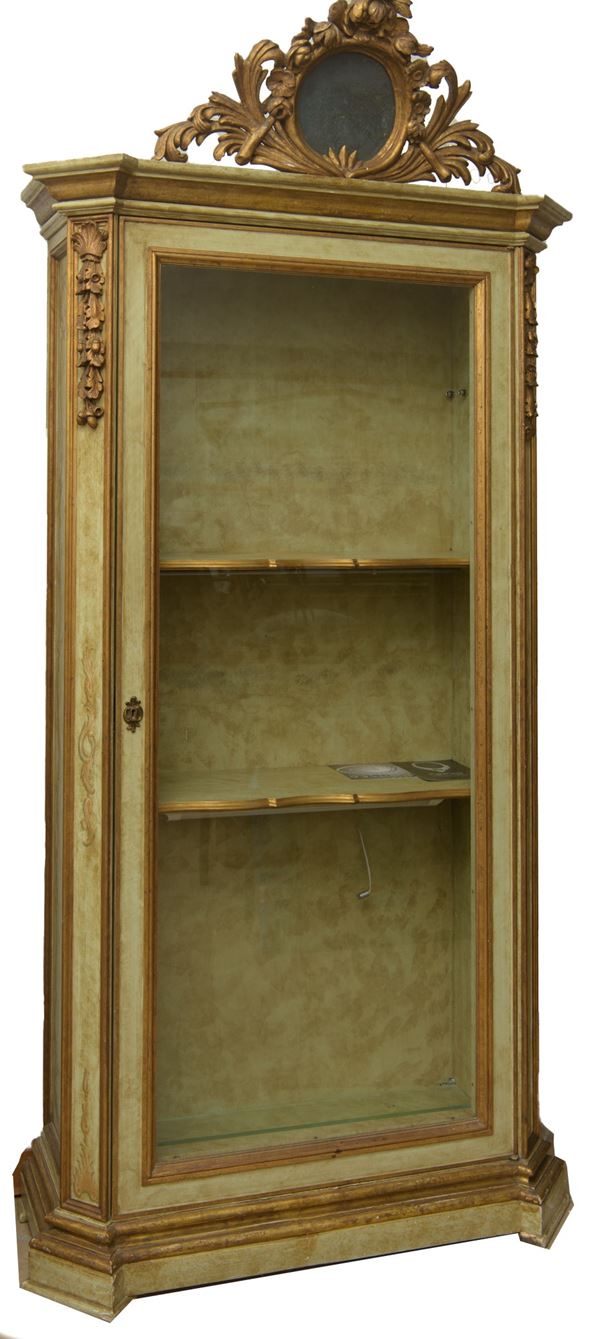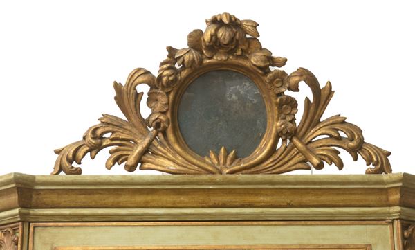 Composta da elementi del XVIII secolo assemblati nel XIX secolo. Ad anta unica in legno laccato e decorato con parti intagliate e dorato, cimasa superiore con specchio.