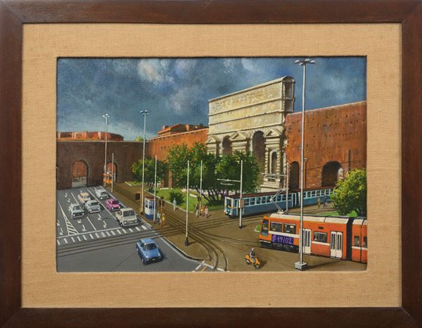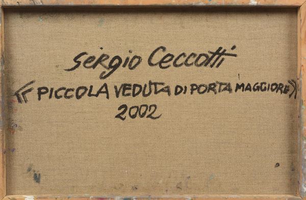 On the back, signed, titled and dated: "Sergio Ceccotti 'Small view of Porta Maggiore' 2002". Framed.